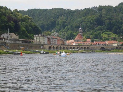 Leider war, um es vorweg zu sagen, die Strömung, dank Niedrigwasser nur 2-3 km/h, was einige Touren zur körperlichen Herausforderung gestaltete. Wir fuhren am Samstag, den 18.7. mit dem Zug bequem (ohne umzusteigen) nach Dresden, wo wir bereits vom parallel fahrenden Begleittross (mit Booten und Gepäck) erwartet wurden. Reinhold Fauck und Sven fuhren den Bus nach Dresden, fanden aber auf dem vorgebuchten Campingplatz niemanden vor, so dass wir (Plan „B“) spontan den Nachbarverein um Aufnahme baten, was relativ problemlos möglich war. Im Nachherein war das prima, die Infrastruktur der Dresdener war super und Einkaufsmöglichkeiten in der Nähe. Auch ein feiner Biergarten lud zum abendlichen Spaziergang ein. Trinken musste man an diesem Tag reichlich, da es drückend heiß war, immerhin zeigte das Thermometer stolze 37° Celsius. Nachdem ausgepackt war, wollten die Kinder baden, was hier auch problemlos möglich war. Leider verletzte sich eins der Kinder schwer und Susanne, Sven und Susanne V. verbrachten den restlichen Abend, statt beim Bier im Biergarten in der Dresdener Uniklinik. Nach 5 ½ Stunden waren wir gegen 2 Uhr nachts dann endlich wieder am Platz zurück und konnten uns ausruhen. Nach der kurzen Nacht hieß es dann am kommenden Tag eine Etappe von Schmilka nach Dresden zu paddeln. Reinhold fuhr den Trailer an die Einsatzstelle. Die restliche Mannschaft (19 Personen, davon 7 Kinder) fuhren mit der Regionalbahn nach Schmilka. Die Tour war wunderschön, wenn man von starkem Gegenwind, nicht vorhandener Strömungsunterstützung und ein wenig Regen mal absah. Besonders das Pillnitzer Schloss ist sehr sehenswert. Es war recht anstrengend, alle waren am Abend ziemlich platt, die Tour war immerhin über 48 km lang.
